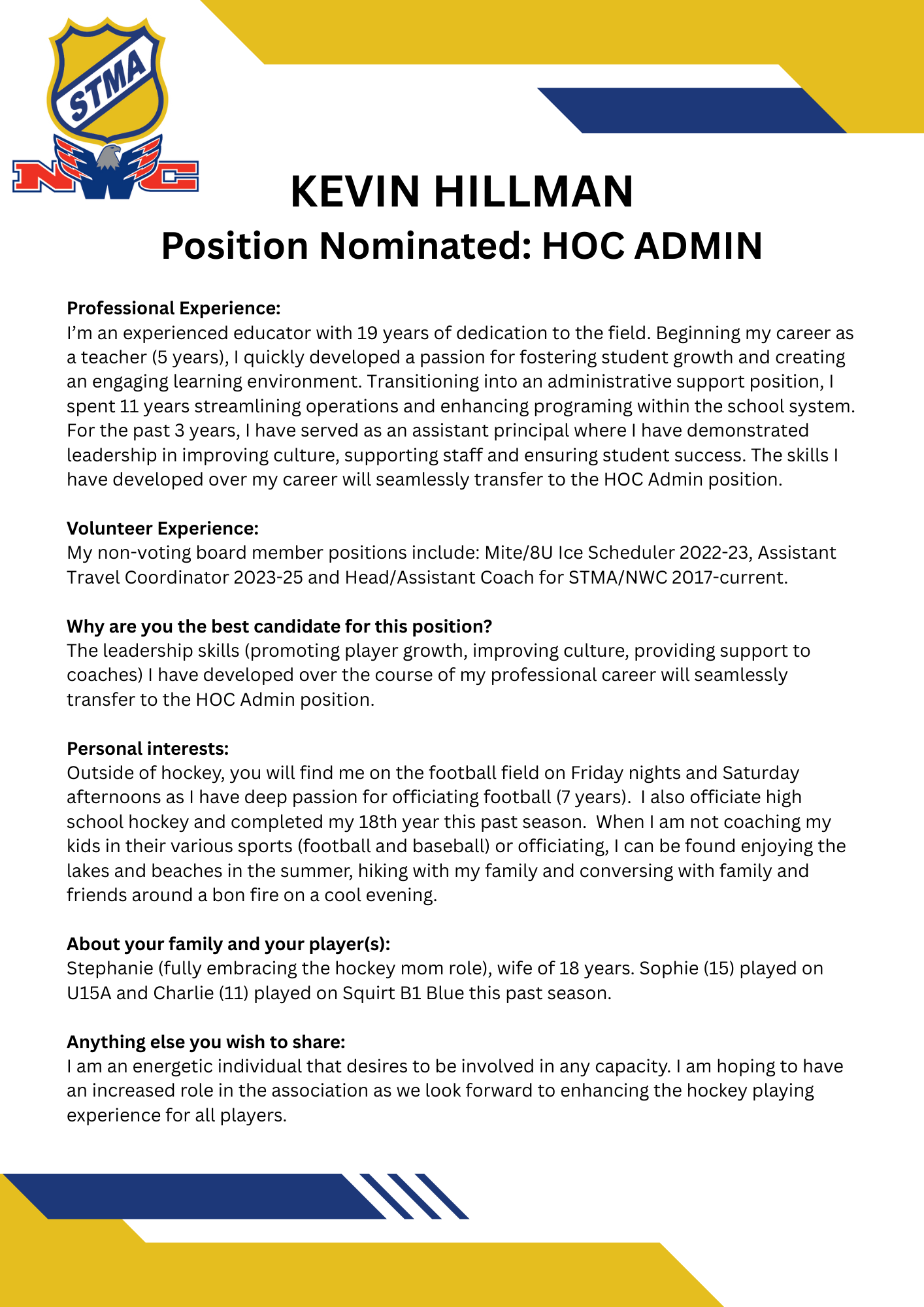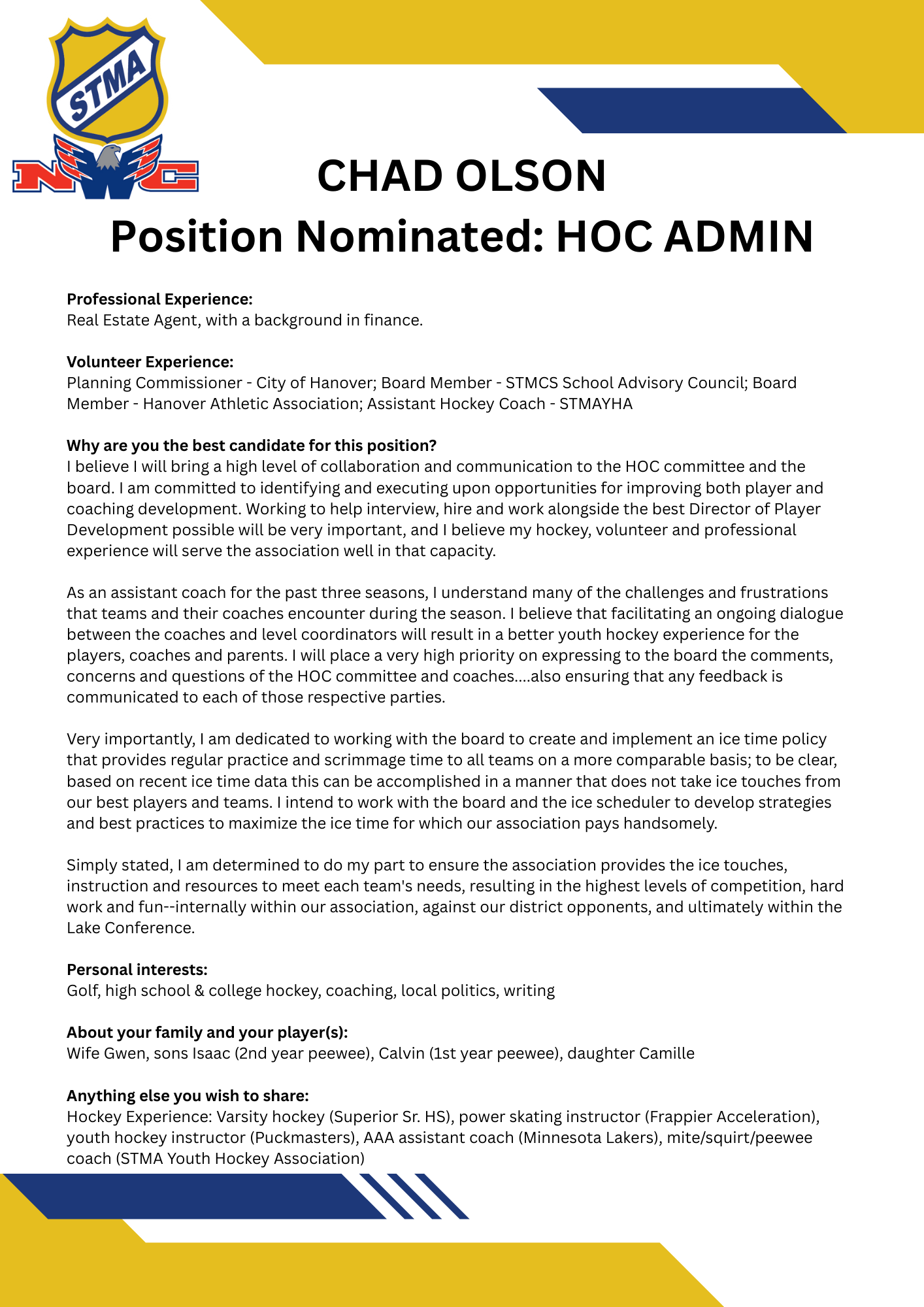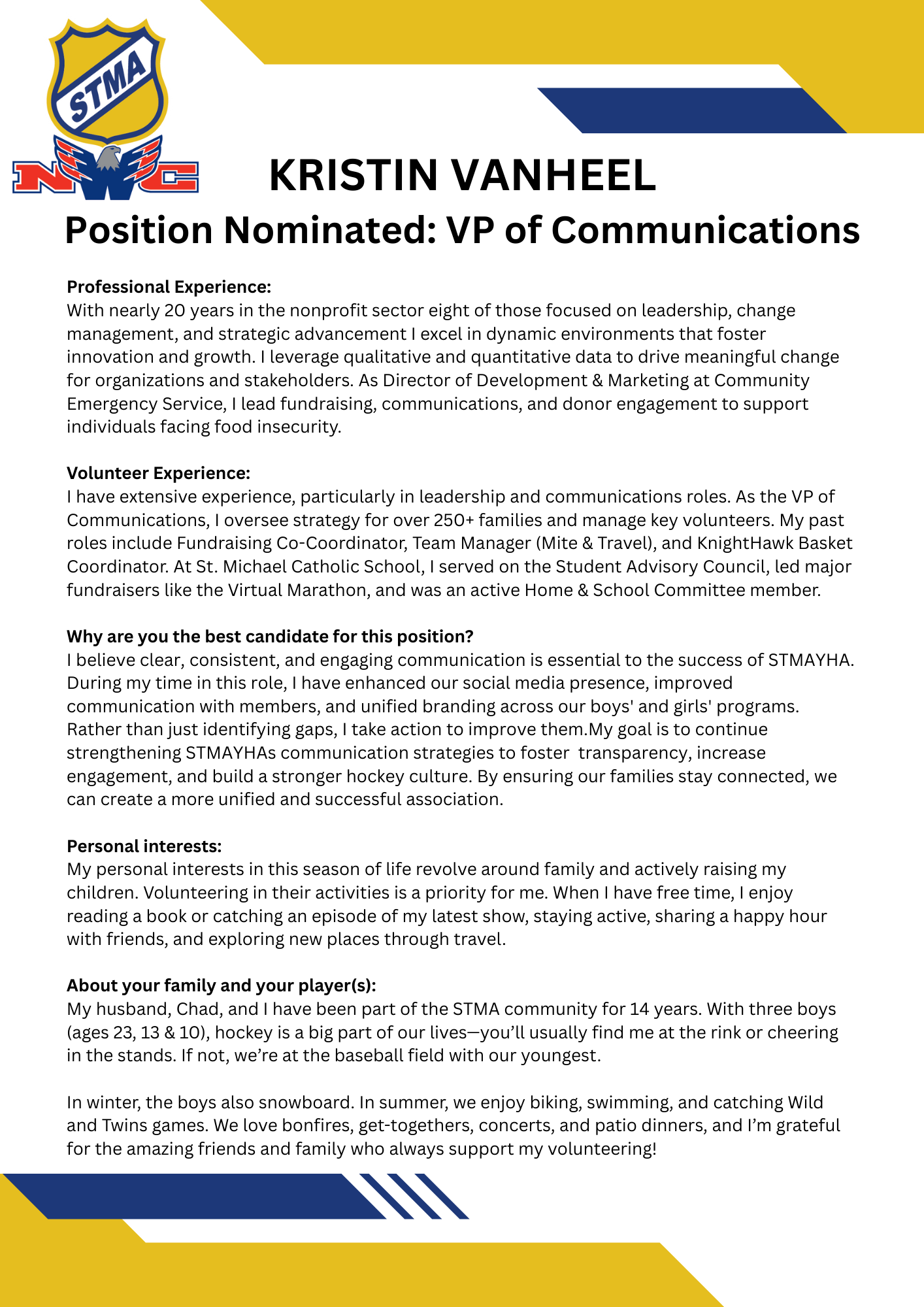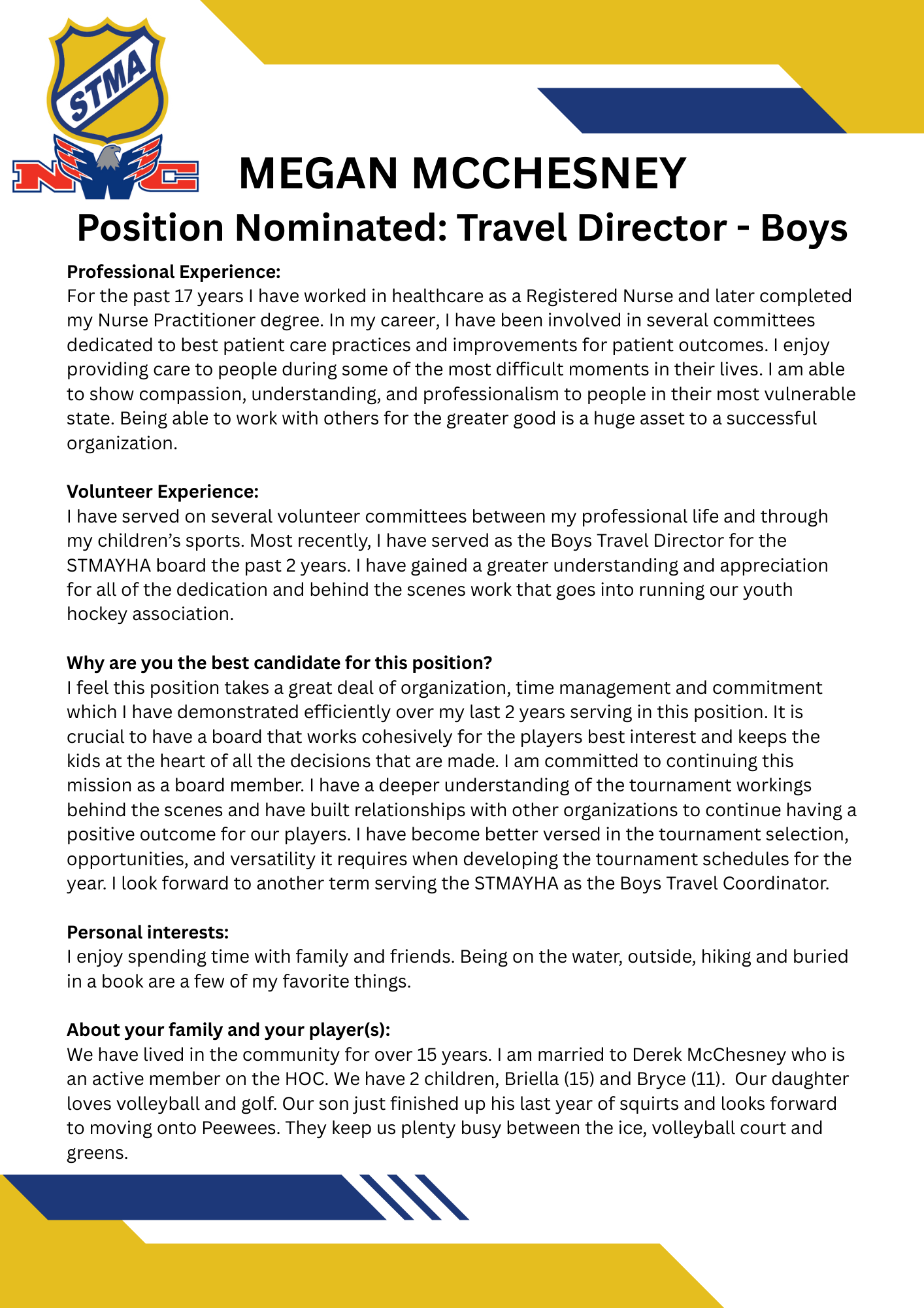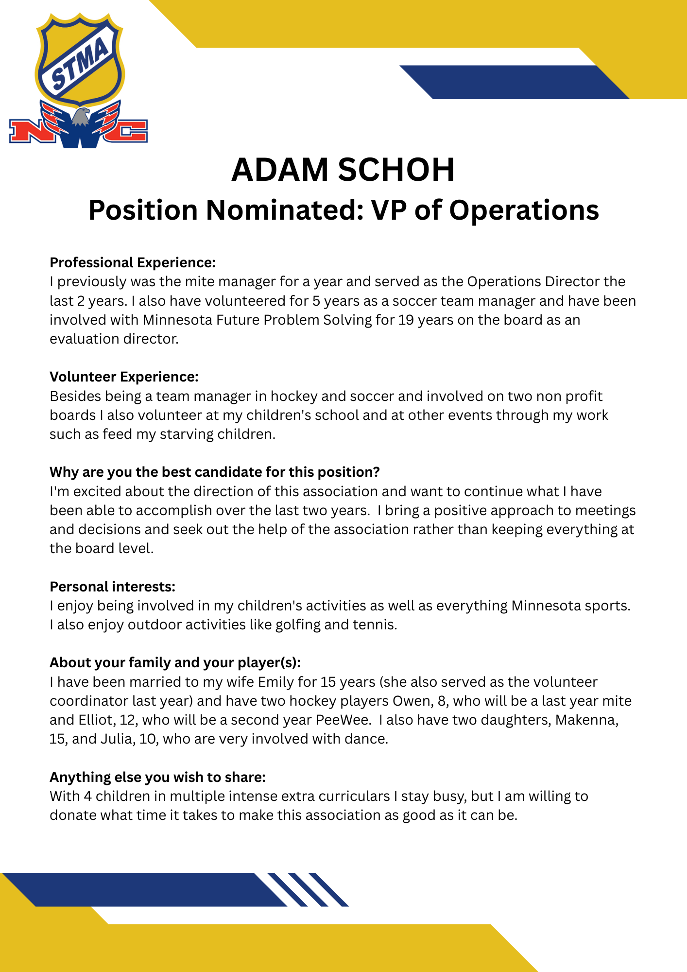 No nominations were made for this position. It will be appointed after the election in accordance with STMAYHA's bylaws.