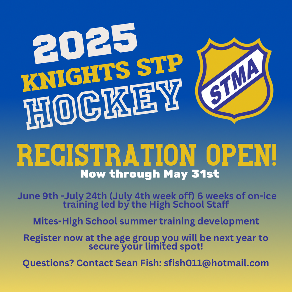 As a high school staff we are excited with the direction the high school and youth programs are heading. I have linked the STP registration for this summer at the bottom of this letter. We will be taking registrations from now until May 31st on a first come, first serve basis. EVERYONE is welcome to participate but we do have to cap each group so that we get the most out of the ice time. Please make sure to sign your kid up for the level they will play at next year. For example, if you are aging out of squirts this year you would sign up for the Peewee STP group. This camp is designed to keep the kids together and keep everyone in STMA playing with their buddies.