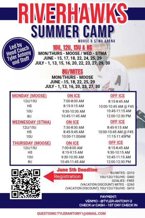 Registration is open for RiverHawks Summer Camp, led by Head Coach Tyler Antony and staff. A great way to stay on the ice and build skills this summer!